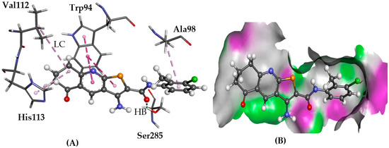 The docked conformation of 1 to the binding site of CXCR4 using ChemPLP. (A) A hydrogen bond (HB) is depicted as a green dotted line between 1 and the amino acids Ser285. Lipophilic contacts (LC) are predicted with Trp94 shown with purple dashed lines; (B) 1 shown in the binding pocket with the protein surface rendered. Purple represents hydrogen bond donor regions and green depicts hydrogen bond acceptor regions.