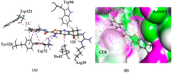 The docked conformation of 1 to the binding site of CLR-RAMP3 using ChemPLP. (A) A hydrogen bond (HB) is depicted as green dotted line between ligand and the amino acid Arg38. Tyr52 and Trp84 are in lipophilic contact (LC) with the ligand shown with dashed purple lines; (B) 1 is shown in the binding pocket with the protein surface rendered and seems to fit in the cleft between CRL and RAMP3. Purple represents hydrogen bond donor regions, and green depicts hydrogen bond acceptor regions.