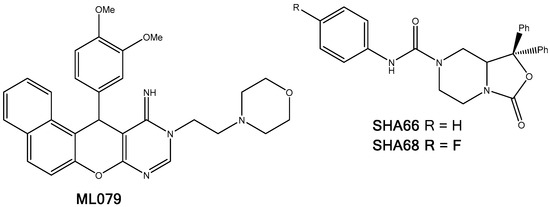 Molecular structures of the known NPSRb1 antagonists, ML079, SHA66, and SHA68.