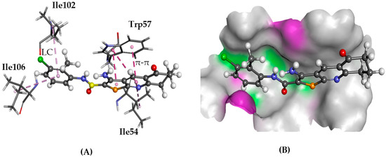 The docked configuration of 1 to the binding site of NPSRb1 using GS scoring function. (A) π-π stacking and lipophilic contact (LC) are depicted as purple lines between the ligand and the amino acids; (B) 1 shown in the binding pocket with the protein surface rendered. Purple represents hydrogen bond donor regions, and green depicts hydrogen bond acceptor regions.