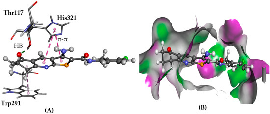 The docked configuration of 1 to the binding site of PRLHR using GS scoring function. (A) A hydrogen bond (HB) is depicted as green lines between the ligand and the amino acid Asn298. The π-π stacking is observed with His321 and Trp291 shown as purple dashed lines; (B) 1 shown in the binding pocket with the protein surface rendered. Purple represents hydrogen bond donor regions, and green depicts hydrogen bond acceptor regions.