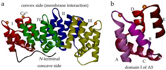 Human annexin A5 (anxA5) structure (PDB: 1ANX). (a) The anxA5 is structurally comprised of an N-terminal (black) and a C-terminal core composed of four domains. The convex side harbors calcium binding sites and is responsible for binding the membrane. The domains and Ca2+ are shown in different colors: domain I, red; domain II, blue; domain III, yellow; domain IV, green; Ca2+, orange balls. (b) Domain I of anxA5 as an example of the repeated domains. Each repeated domain is composed of five α-helices: A, B, C, D and E.