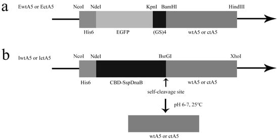 As shown in Figure 3b,c, wtA5 and ctA5 proteins were successfully purified with purities of 93.9% and 98.0%, respectively. The yield of wtA5 and ctA5 proteins was 12 mg and 6 mg per liter of bacterial culture, respectively. The apparent relative MWs of the proteins were consistent with the theoretical MWs (wtA5, 35.9 kDa; ctA5, 28.3 kDa) and related work [31,32]. This method for the production of non-fusion protein based on SspDnaB intein is convenient, and can produce proteins of high purity.