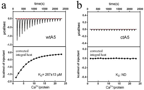 Titration of wtA5 and ctA5 with calcium. (a) Titration of 60 μM wtA5 with 7 mM calcium. (b) Titration of 60 μM ctA5 with 7 mM calcium. For each profile, the top shows the raw ITC data output during titration. The bottom represents the experimental points and the best fit. The points are derived from the raw data, and the heat of dilution was subtracted using the blank control of buffer titrated with calcium. The solid line at the bottom of each profile represents the best fit. n = 2.