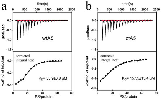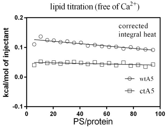 Subsequently, ITC was used to observe the binding between PS (POPS-containing liposome) and wtA5 or ctA5 protein, examining whether truncation of domain IV would affect the binding between them. There was an obvious change in heat during liposome titration in the presence of calcium (Figure 5), but not when calcium was absent (Figure 6), indicating that the interaction between liposome and wtA5 or ctA5 is calcium-dependent. The KD of wtA5 or ctA5 binding to PS was 55.9 μM and 157.5 μM, respectively (Table 2), indicating that the affinity of ctA5 binding to PS is lower than wtA5. The ctA5 protein cannot bind calcium, but binds to PS-containing liposome only in the presence of calcium. These results indicate that the truncation of domain IV impairs the PS-binding affinity of anxA5.