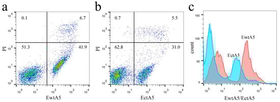 AnxA5 proteins are widely applied in the field of apoptosis detection, utilizing its high affinity for PS expressed on apoptotic cells. To investigate the role of domain IV, a flow cytometry (FCM)-based apoptosis detection assay was used to estimate and compare the ability of EwtA5 and EctA5 proteins to label apoptotic cells. The EctA5-labeled cells showed a different distribution ratio compared with that of EwtA5 (Figure 7a,b). Statistical analysis (p ≤ 0.01, n = 3) revealed significant differences between the ratios. However, there was no significant difference (p = 0.1268) between the ratios of PI (propidium iodide)-positive cells. Thus, the differences in the distribution ratios of cells in Figure 7a,b were caused by the proteins but not PI. There is an obvious movement to the left in the histogram of cells labeled with EctA5 compared to that of EwtA5 (Figure 7c), indicating that the ability of EctA5 to label apoptotic cells has been impaired.