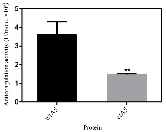 APTT assay of wtA5 and ctA5 proteins. The anticoagulation activity of ctA5 was significantly (p = 0.0068, n = 3) lower than that of wtA5.