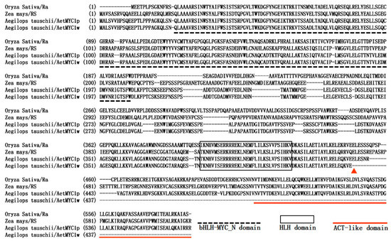 Amino acid sequence alignment of bHLH transcription factors AetMYC1, RS and Ra. The black dotted lines represent the conserved bHLH-MYC_N domain, the black rectangle represents the HLH domain, and the red dotted lines represent the ACT-like domain. The red triangle represents the location of the stop codon.