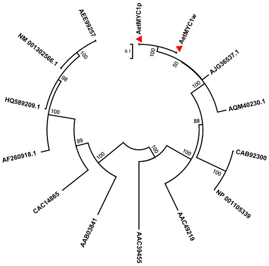 Phylogenetic relationships between AetMYC1 and bHLHs in other species. The accession numbers of these proteins are as follows: AJG36537.1: Triticum aestivum/TaMYC1; AQM40230: Hordeum vulgare/HvMYC1; AAC49219: Oryza sativa/Ra; CAB92300: Zea mays/Hopi; NP_001105339: Zea mays/SN; AAB03841: Zea mays/IN1; CAC14865: Arabidopsis thaliana/TT8; AEE99257: Nicotiana tabacum/AN1a; NM_001302566.1: Nicotiana tabacum/AN1-like; HQ589209.1: Nicotiana tabacum/AN1b; AF260918.1: Petunia x hybrida/AN1; AAC39455: Petunia x hybrida/JAF13.