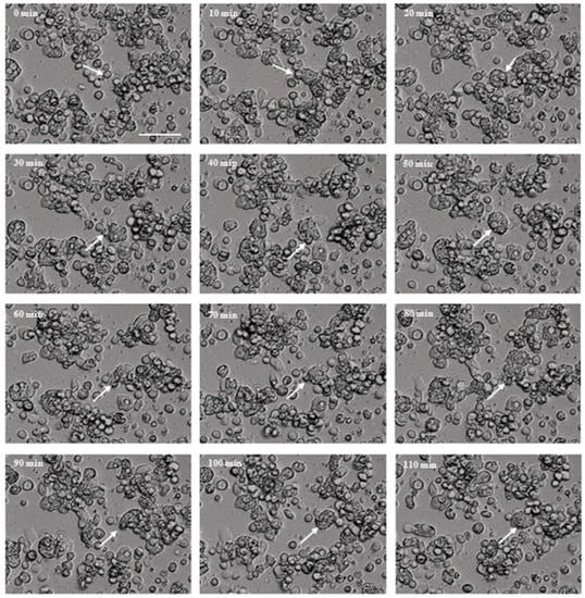 Acanthamoeba castellanii NCKH_D induced cell damage by disruption of C6 cells. The observation of C6 cell co-incubated with Acanthamoeba castellanii NCKH_D in time-lapse microscopy every 10 min for 2 h. The white arrow: the disrupted C6 cell was attacked by Acanthamoeba castellanii NCKH_D. Scale bar = 50 μm.