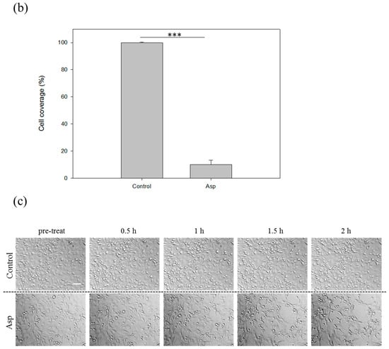 Acanthamoeba castellanii NCKH_D secreted proteins induced cell damage by disruption of C6 cells. The observation of C6 cell co-incubated with Acanthamoeba castellanii NCKH_D secreted proteins for 2 h by CPE assay (a) and time-lapse microscopy (c); (b) Quantification of the coverage of C6 cells after co-incubated with secreted proteins for 2 h; (c) The morphology of C6 cells in control and Asp treated groups by time-lapse microscopy. Those results were means ± S.D. (standard deviation) of triplicate independent experiments. *** p < 0.01. Scale bar = 50 μm.