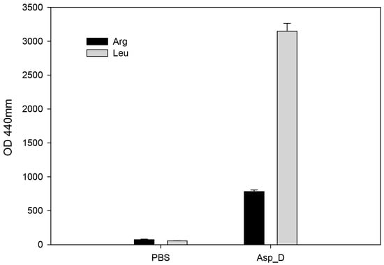 Following the steps described in Section 4.4 Isolation of secreted proteins and using PBS buffer as the control the activity of Asp was assayed by the hydrolysis of l-leucine-7-amido-4-methylcoumarin hydrochloride (Leu-AMC) and l-arginine-AMC (Arg-AMC, Sigma-Aldrich). Five μL of Asp solution was added to 195 μL of assay buffer (50 mM Tris-HCl, pH 8.0) containing 10 μM Leu-AMC or Arg-AMC and incubated for 30 min at 37 °C. The release of fluorescence was measured at an excitation wavelength of 370 nm and an emission wavelength of 440 nm using a FlexStation 3 Multi-Mode microplate reader (Molecular Devices, Sunnyvale, CA, USA) [].