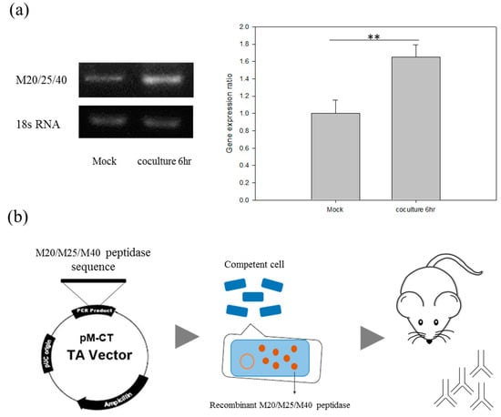 In order to clary the virulence factors in Asp, we combined the RNA-seq data and comparative proteomic analysis of extracellular secreted proteins, which were both collected from ATCC 30010 and NCKH_D Acanthamoeba cells to identify the candidate proteins [,]. From the analysis, we noticed that a protein, the M20/M25/M40 superfamily aminopeptidase protein (ACA1_264610), is expressed and secreted by NCKH_D but not ATCC 30010. Interestingly, we found that the gene expression level of M20/M25/M40 superfamily aminopeptidase protein is upregulated in NCKH_D after Acanthamoeba and C6 cell co-culturing for 6 h. The quantified RNA expression patterns of the M20/M25/M40 superfamily aminopeptidase protein are shown in Figure 5a.