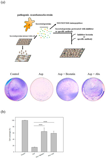 Aminopeptidase of Acanthamoeba castellanii induced cell damage of C6 cells. (a) Evaluation the treatment effect of inhibitor and antibody of aminopeptidase in Acanthamoeba infection. The inhibitor and antibody reduced the cell disruption of C6 cells co-incubation with Asp for 2 h by CPE functional assays; (b) Quantification of the coverage of C6 cells after co-incubated with secreted proteins for 2 h. Bestatin: inhibitor. Abs: the specific antibody of M20/M25/M40 aminopeptidase. Those results were means ± SD of triplicate independent experiments. *** p < 0.01.