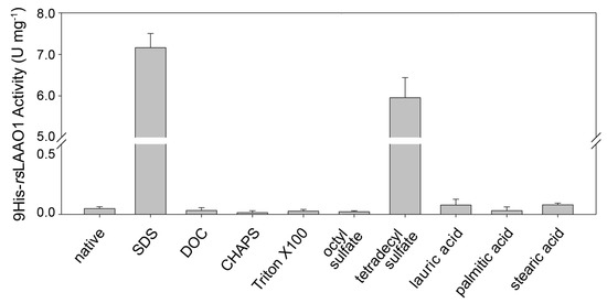 Recombinantly expressed and purified MBP-rsLAAO1 and 9His-rsLAAO1 can be strongly activated by 1 mM SDS as described earlier [13]. First, we examined whether other detergents or fatty acids are able to activate purified 9His-rsLAAO1. MBP-P-9His-rsLAAO1 was expressed in the E. coli strain Arctic Express at 11 °C, cells were lysed and the soluble fractions applied to amylose resin. After digestion with PreScission protease, 9His-rsLAAO1 was further purified using Ni2+-NTA resin. 0.1 mg∙mL−1 9His-rsLAAO1 was preincubated with 1 mM SDS, the anionic detergent deoxycholate, the zwitterionic detergent CHAPS (3-[(3-cholamidopropyl)dimethylammonio]-1-propanesulfonate) or the nonionic detergent Triton X-100. Afterwards, enzymatic activity was assayed using arginine as substrate and o-dianisidine and peroxidase to measure initial production of hydrogen peroxide. Deoxycholate (DOC), CHAPS or Triton X-100 did not stimulate the activity of 9His-rsLAAO1 compared to untreated samples (Figure 1).