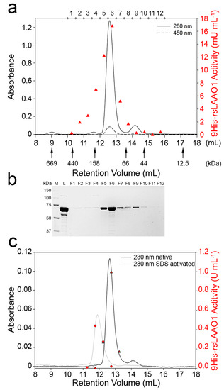 Most l-amino acid oxidases are active only as homodimers [4]. However, an l-AAO from the fungus Trichoderma harzianum ETS323 is secreted as an active monomeric or dimeric form depending on cultivation conditions [5]. Therefore, we analyzed the dimerization state of recombinant purified 9His-rsLAAO1 by size-exclusion chromatography (SEC). The major protein peak of native protein was detected at an elution volume of 12.6 mL (Figure 2a).