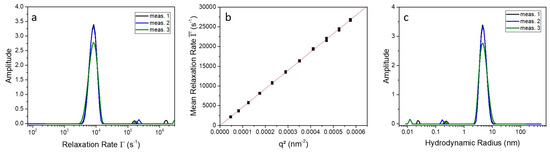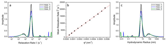 (a) Relaxation rate distribution of three individual measurements of the SDS-activated 9His-rsLAAO1 protein measured at an angle of 60° and a temperature of 20 °C; (b) Mean relaxation rate as a function of ; (c) Determined size distribution of SDS-activated 9His-rsLAAO1 at 20 °C and a scattering angle of 60°.