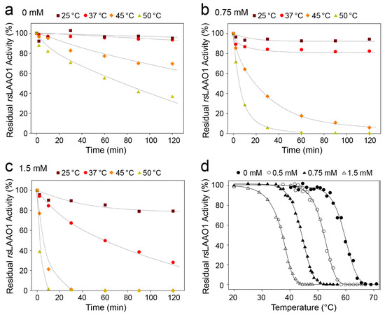 Thermal inactivation of 9His-rsLAAO1 was accelerated by increasing concentrations of SDS. Purified 9His-rsLAAO1 (0.1 mg∙mL−1) was incubated with (a) 0 mM SDS; (b) 0.75 mM SDS or (c) 1.5 mM SDS at 25 °C (purple squares), 37 °C (red circles), 45 °C (orange diamonds) or 50 °C (yellow triangles) for the indicated amount of time and assayed for residual enzymatic activity using a coupled peroxidase o-dianisidine assay with arginine as substrate; (d) The residual activity of 9His-rsLAAO1 (0.1 mg∙mL−1) was measured after a preincubation of 10 min at the indicated temperature in the presence of 0 mM (filled circles), 0.5 mM (open circles), 0.75 mM (filled triangles) or 1.5 mM SDS (open triangles).