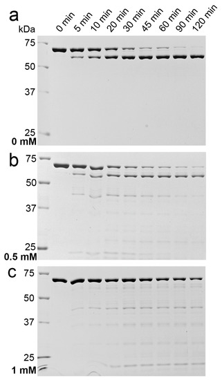 Increased proteolytic sensitivity of 9His-rsLAAO1 after SDS treatment. Purified 9His-rsLAAO1 (0.3 mg∙mL−1) was incubated with 0.3 µg∙mL−1 trypsin at 37 °C for the indicated periods of time (a) in the absence; (b) in the presence of 0.5 mM SDS or (c) in the presence of 1 mM SDS. Samples were separated by SDS–PAGE and stained with Coomassie.