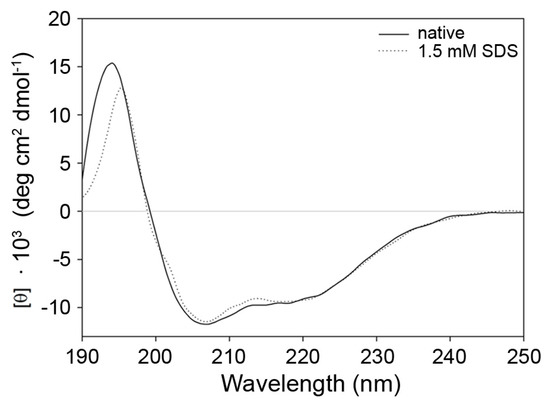 Next, different types of spectroscopy were applied to analyze secondary and tertiary structure changes in the protein. Circular dichroism (CD) spectra in the range of 190–260 nm are very specific for different peptide secondary structures. For example, α-helical peptides give rise to characteristic minima in ellipticity at 208 nm and 222 nm, β-sheets at 218 nm. Therefore, CD spectroscopy was used to calculate the secondary structure content. The secondary structure of 9His-rsLAAO1 consists of 43% α-helices (standard deviation 2.9%) and 17% β-sheets (standard deviation 3.4%) in five independently purified enzyme preparations according to the CDSSTR algorithm used by the DichroWeb server [22]. The secondary structure content of 9His-rsLAAO1 in the presence of 1.5 mM SDS was calculated as 44% α-helices (standard deviation 6.3%, n = 5) and 17% β-sheets (standard deviation 3.8%) (Figure 7).