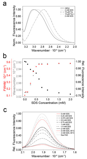 The fluorescence properties of tryptophan residues depend on the polarity of the surroundings and the position of neighboring amino acid side chains, which influence the wavenumber of the emission maximum and the fluorescence intensity [23]. 9His-rsLAAO1 contains 16 tryptophan residues. The emission maximum of native, untreated 9His-rsLAAO1 was observed at a higher wavenumber (thus a lower wavelength) than that of tryptophan (Figure 8a). This observation is typical for a protein with tryptophan residues in hydrophobic surroundings. In the presence of 2 mM SDS, the emission maximum shifted partially to lower wavenumbers (higher wavelengths), while this concentration of SDS did not have an effect on the wavenumber of the emission maximum of free tryptophan (Figure 8a). A maximal shift in the emission maximum was reached at 0.7 mM SDS for 9His-rsLAAO1 (Figure 8b). In addition, SDS caused a broadening of the fluorescence band by the shift in emission maximum of some of the 16 tryptophans (Figure 8a), which was quantified as an increase in the full width at half maximum (FWHM, Figure 8b). A hydrophobic environment increases the intensity of the tryptophan fluorescence. Accordingly, in 9His-rsLAAO1, this fluorescence intensity was reduced by SDS treatment (Figure 8b). Again, little changes occurred above 1 mM SDS corresponding to the maximal activation of 9His-rsLAAO1 at 1–2 mM SDS [13].