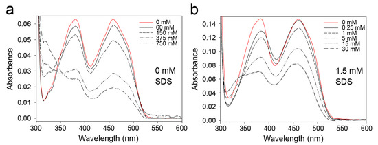 Therefore, we tested whether the reactivity towards sulfites in 9His-rsLAAO1 is influenced by SDS. Adduct formation with sulfites reduces the absorbance of FAD at 380 and 450 nm. At least 150 mM sulfite was required for a strong reduction in FAD absorption in native 9His-rsLAAO1 (Figure 9a). By contrast, adducts were formed already at 5 mM sulfite in 9His-rsLAAO1 treated with 1.5 mM SDS (Figure 9b). Again, these data suggest that SDS influenced the conformation at the active site, thereby increasing the accessibility for ionic reagents.