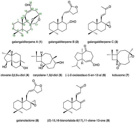 In the present study, we isolated galangalditerpenes A (1, 0.00180%), B (2, 0.00121%), and C (3, 0.00475%), clovane-2β,9α-diol (4, 0.01341%) [17], caryolane-1,9β-diol (5, 0.00916%) [17], (−)-2-oxoisodauc-5-en-12-al (6, 0.00098%) [18], kobusone (7, 0.00066%) [17], galanolactone (8, 0.00148%) [7], and (E)-15,16-bisnorlabda-8(17),11-diene-13-one (9, 0.00136%) [19], from an 80% aqueous acetone extract of the fruit of A. galanga [13] using normal-phase silica gel and reversed-phase ODS CC, and finally preparative HPLC (Figure 1).