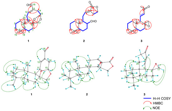 1H–1H COSY, HMBC, and NOESY correlations of 1–3.