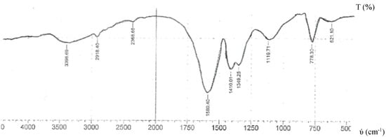 The IR spectral data of NBTCS and its complexes are displayed in Table 3. The N–H stretching vibration for NBTCS was observed as a broad band at 3407 cm−1, this can be seen in Figure 2. However, in Nd(III) and Tl(III) complexes, this band disappeared. This suggests that the N–H was deprotonated prior to complexation. The IR spectrum of Nd(III) complex as shown in Figure 3 has a broad band at 3399 cm−1, assignable to water of hydration from the metal salt. This was further confirmed by the presence of a sharp peak at 778 cm−1 due to O–H bending vibrations. The peak observed around 3046 cm−1 in the Tl(III) complex was assigned to aromatic C–H stretching vibration. The peaks at 1545 and 1465 cm−1 in the ligand were assigned to C=N stretching vibration of benzothiazole ring. In the Nd(III) complex, these shifted to 1589 and 1410 cm−1 while in the Tl(III) complex a single peak at 1548 cm−1 was obtained. This suggest that the C=N of benzothiazole was involved in the coordination [21,29]. This was further supported by emergence of M–N bands between 392 and 420 cm−1. The medium peaks observed between 1154 and 1120 cm−1 in the compounds were assigned to SO2 stretching vibration. The observed decrease in wavenumber of the complexes up to 34 cm−1 suggests coordination through SO2 group. Similar observation has been made in the literature [44]. The Nd(III) complex showed new band at 1349 cm−1 due to ionic nitrate [45]. A medium band assigned to M–O stretch was observed in the Nd(III) complex at 621 cm−1. The medium bands at 953, 827, 750 and 845 cm−1 in the compounds were assigned to C–H bending vibration of substituted benzene ring [46]. The spectra of the compounds are in the Supplementary Materials.