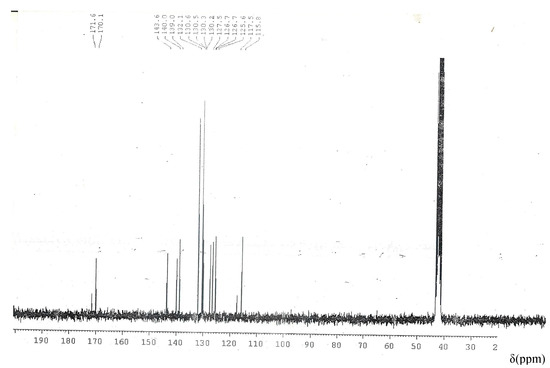 Figure 4 gives the structure of the ligand showing carbon numbering. 13C-NMR spectrum of the ligand as shown in Figure 5 has a peak at 115.80 ppm attributed to benzothiazole ring carbon (C1). Peaks assigned to benzothiazole ring carbon (C2) appear at 126.70 ppm. Peaks at 139.0 and 140.0 ppm are assigned to benzothiazole ring carbon (C3) and (C4) respectively. Peak at 170.10 ppm is attributed to benzothiazole ring carbon (C5). Peaks at 132.10 and 143.60 ppm are assigned to phenyl ring carbon (C6) and (C9) respectively. The increase in chemical shift of C6 and C9 are due to increase in the electronegativity of the atoms attached to them. C9 shows a higher value than C6 because chlorine which is attached to it is more electronegative than sulphur which is attached to C6. Peaks assignable to phenyl ring carbon (C7) and (C8) are observed at 130.30 and 130.60 ppm respectively. Similar observations have been made in literature [21,22,29,44]. The 13C-NMR of the complexes show none of the peaks except for the solvent peak at 40.0 ppm. The spectra of the compounds are in the Supplementary Materials.