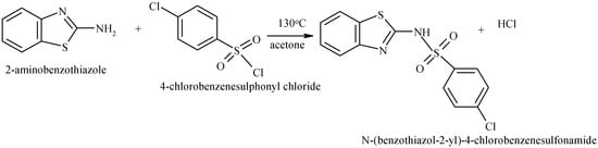 To a solution of 2-aminobenzothiazole (3.0 g; 20 mmol) in acetone (15 mL) was added 4-chlorobenzenesulphonylchloride (4.24 g; 20 mmol) with stirring. The mixture was refluxed for 45 min at 130 °C. A white precipitate was formed, which was recrystallized from absolute ethanol, dried and stored in a desiccator over anhydrous CaCl2. This is shown in Scheme 1. The yield was 40.83% and the melting point 220–222 °C.