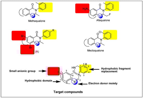 A literature study explains that the existence of quinazoline nucleus in the molecule is a necessary requirement for the anticonvulsant activity. This nucleus can be substituted on the heteroatom or the aromatic ring, as shown in Figure 1. Moreover, the quinazoline moiety with a suitable substituent, mostly amine or a substituted amine at the 4-position, and either a halogen or electron-rich substituent at the 6-position or 8-position, is known to improve antiepileptic activity [5,6]. Based on the previous rationale, it was believed to be valuable to study the effects of two pharmacophoric groups, like quinazoline and aromatic amine, in one molecule for anticonvulsant activity. The quinazoline nucleus is attached to an aromatic unit via a (CH2) linker. This design formed new quinazoline derivatives that possess essential features of the lead structure methaqualone. Selection of the aromatic amines was following the Hansch manual method of drug design which was proposed by Topliss [11]. It is a technique in which the substituents are nominated, ordered, and tested based on the effectiveness. A fluorine atom was selected as a substituent on the quinazoline moiety owing to its safety, small size, low steric interference, and ready availability [12,13]. Additionally, the presence of fluorine at the 6-position could enhance the pharmacokinetic and pharmacodynamic properties of the newly-synthesized compounds [6,13]. The title compounds were synthesized as an attempt to find new efficient and safe anticonvulsants. Similarities between the reported anticonvulsants methaqualone, afaqualone, mecloqualone, compound (A) and our newly-designed compounds are shown in Figure 1.