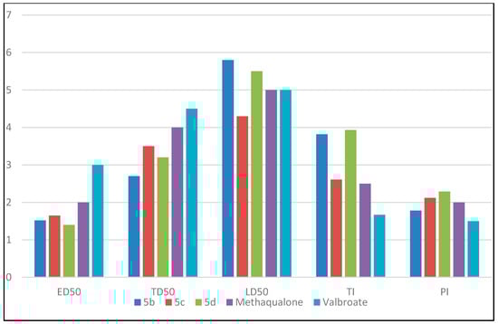 The most active compounds 5b, 5c, and 5d, were exposed to further investigations in mice to determine and quantify their anticonvulsant activity. Further investigations included the study of the effective dose that caused protection for 50% of mice (ED50) and that produce minimal neurological toxicity in 50% of mice (TD50) to determine their neurotoxicity, as shown in Table 2.