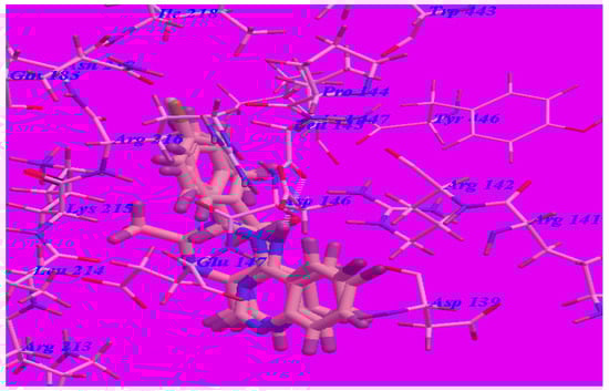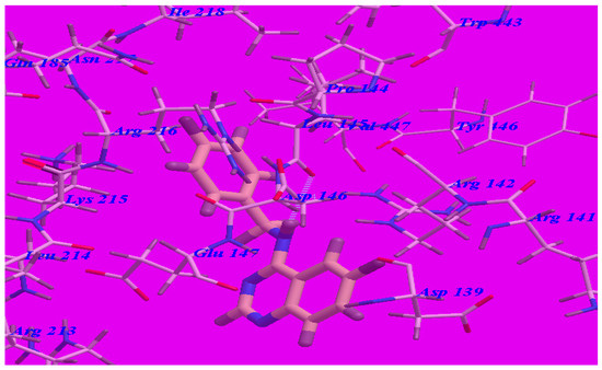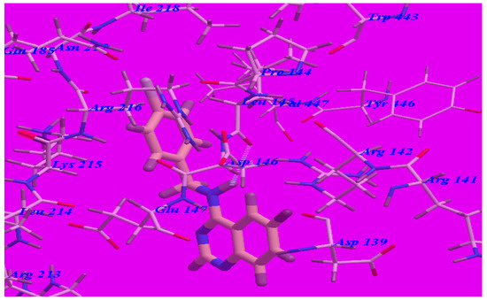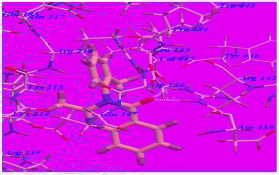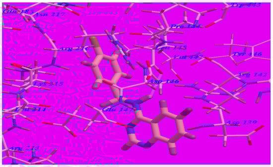 The proposed binding mode of methaqualone revealed an affinity value of –50.69 kcal/mol and the carbonyl group formed two H-bonds with Arg142 (–NH groups) with distances of 1.65 Å and 2.38 Å (see Figure 5). The quinazolinone moiety occupied the hydrophobic pocket formed by Asp139, Arg142, Asp146, Glu147, and Arg213. The phenyl ring at the 3-position was oriented in the hydrophobic cleft formed by Leu145, Asp146, Lys215, Arg216, and Ile218. The methyl group at 2-position was oriented in the hydrophobic cleft formed by Arg142, Leu145, and Val447.
