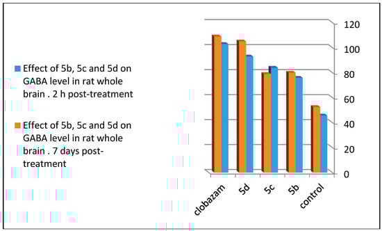 Comparison between the effects of 5b, 5c, and 5d on the GABA level in rat whole brain 2 h post-treatment and seven days post-treatment.