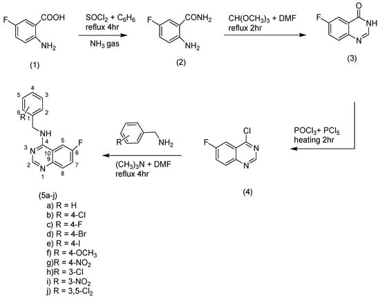 Substituted-6-fluoro-quinazoline-4-amine (5a–j) derivatives were synthesized according to the methods outlined in Scheme 1. Synthesis of 2-amino-5-fluorobenzamide (2) was accomplished by refluxing of thionylchloride and 2-amino-5-fluorobenzoic acid in benzene, then the mixture was exposed to dry ammonia gas. 6-fluroquinazolin-4(3H)-one (3) was prepared by reaction of the amide compound (2) with trimethoxymethane in dimethylformamide (DMF). Chlorination of compound (3) was performed by heating (3) with a mixture of phosphorous oxychloride and phosphorous pentachloride. A nucleophilic displacement reaction for the chloroquinazoline (4) was accomplished through treating of compound (4) with different substituted aromatic amines in the presence of trimethylamine to obtain the title compounds (5a–j). Infrared, mass spectrometry, 1H nuclear magnetic resonance (NMR), 13C-NMR, and elemental analyses were performed to confirm all structures. The title compounds contained different substituents with different electronic environments, as shown in Scheme 1. These substituents are joined to the fixed moiety 6-fluroquinazoline. They included different hydrophilic and hydrophobic groups, either electron-deficient or electron-rich groups, to study and compare their anticonvulsant activity.