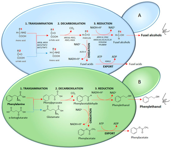 The Ehrlich pathway. Catabolism of aromatic amino acids (Phe, Tyr, and Trp), branched-chain amino acids (Leu, Val, and Ile) and sulphur-containing amino acids (Met) leads to the formation of fuse acids and fusel alcohols (A). Genes encoding enzymes involved in each step are shown. The catabolism of phenylalanine via the Ehrlich pathway leads to the formation of phenylethanol and phenylacetate (B).