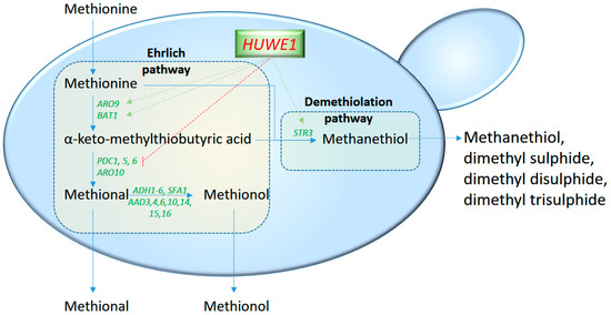 Overview of Huwe1-mediated regulation of the Ehrlich and demethiolation pathways. E3 ubiquitin-protein ligase Huwe1, a key constituent of the ubiquitin-proteasome system, increases the expression of the genes ARO9 and BAT1 of the Ehrlich pathway and of the demethiolation pathway gene STR3 (green arrows), but suppresses (red arrow) the expression of Ehrlich pathway genes PDC1, PDC5, PDC6, ARO10 in S. cerevisiae [51].