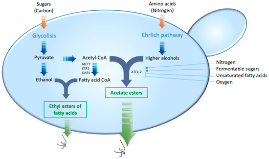 Esters are formed during alcoholic fermentation, malolactic fermentation and ageing. There are many factors that influence the types and quantities of esters present, and, although not all of them are positive contributors, they constitute a major group in wine. Esters present in wines can have different origins: grapes, yeasts and bacteria. The esters from grapes are relevant in wines only in particular cases [53], the most important esters for wine aroma being synthetised by yeasts.