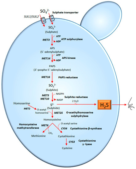 In S. cerevisiae, H2S is produced by the sulphate reduction sequence (SRS) pathway (Figure 4). The SRS pathway is induced when there is a metabolic demand for cysteine and methionine, which are usually limited in must [66,84,86,87,88]. When there are insufficient nitrogen sources, the precursors for these amino acids (O-acetylserine and O-acetylhomoserine) will also be limited. The lack of precursors supposes that the pathway stops at sulphide. The sulphide, which cannot be sequestered by O-acetyl serine and O-acetyl homoserine to form methionine or cysteine, produces H2S. This volatile gas can accumulate and diffuse into the wine [66].