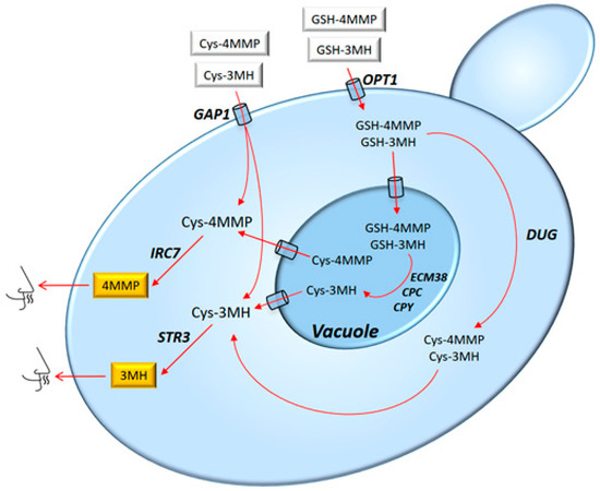 The S. cerevisiae genes required for the conversion of conjugated precursors into varietal thiols in wine have been identified [105]. The uptake of the precursors is mediated by general amino acid transporters, being the GAP1 and OPT1 transporters responsible for the uptake of the major part of the cysteinylated and glutathionylated precursors, respectively [106,107].