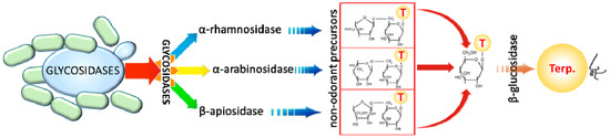 The mechanism for the liberation of sugar-bound monoterpenes occurs in two sequentially steps: first, the enzymes α-l-rhamnosidase, α-l-arabinofuranosidase, β-d-xylosidase or β-d-apiosidase cleavage the bound between the terminal glucose and rhamnose, arabinose, xylose or apiose, respectively; then, a β-d-glucosidase hydrolytic enzyme releases the correspondent monoterpenol [128] (Figure 6). Thus, yeast glycosidase enzymes have a great relevance in winemaking because they are responsible for revealing the aromatic terpene compounds from their glycosilated precursors during alcoholic fermentation.