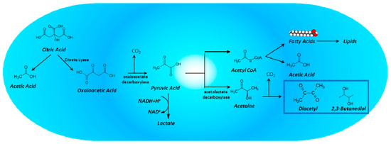 Citric acid, one of the acids present in both grapes and must, is generally found at lower concentrations (0.1–1 g/L) than major organic acids such as tartaric (2–8 g/L) and malic acids (1–7 g/L). Wine LAB are able to metabolise citrate, obtaining acetic acid and diacetyl as end products, and therefore impacting the aromatic quality of wine [147].