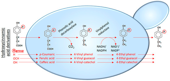 Brettanomyces (teleomorph, Dekkera), with B. bruxellensis as the most frequently encountered representative, is considered a wine spoilage yeast due to the production of 4-ethylphenol and 4-ethylguaiacol, the most abundant off-aromas produced by this species, among others (4-ethylcatechol, 4-vinylguaiacol, 4-vinylphenol and 4-vinylcatechol). These phenolic off-flavours are described as horse sweat, humid leather, smoky, plastic, phenolic, medical, band-aid and poultry yard [151,152]. However, an increasing number of authors has reported that in particular cases, these yeasts can produce desired aromas that increase the flavour complexity of fermented beverages [153]. As stated before, 4-ethylphenol and 4-ethylguaiacol are the main phenolic off-flavours produced by Brettanomyces. They are produced in a two-step pathway (Figure 8) due to the decarboxylation of the corresponding hydroxycinnamic acids (caffeic, p-coumaric and ferulic acids), followed by a reduction of the intermediate 4-vinylphenols [154,155,156]. Hydroxycinnamic acids are widespread in plants, where they are found in leaves, fruits, seeds and roots [157]. In grapes, hydroxycinnamic acids primarily consist of caffeic, ferulic and p-coumaric acids [157] and are present at concentrations and proportions that depend on numerous viticultural factors such as grape variety, ripeness, sun exposure, orography, harvest date and geographical region, among others [158].