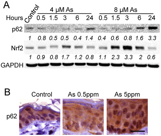 All animals were handled according to the Guide for the Care and Use of Laboratory Animals, and studies have been approved by the University of Illinois at Chicago Institutional Animal Care and Use Committee. Male nude mice were purchased from Harlan at 4 weeks of Age. Mice were housed at 21 °C, on a 14:10-h light/dark schedule in polysulfone solid-bottom cages and double-deionized water was supplied from glass bottles. Animals were fed ad libitum a certified irradiated heavy metal-reduced diet (Teklad 2018C; Harlan). Nude mice (n = 3 per group) were treated with vehicle or sodium arsenic (0.5 or 5 ppm) via drinking water for six months. The 0.5 ppm concentration is consistent with environmentally relevant arsenic exposure associated with carcinogenesis in humans, including skin carcinogenesis [39,40,41]. A does of 5 ppm represents a higher dose of relevant arsenic exposure in humans and was used to verify the effect of arsenic in a dose–response manner compared to 0.5 ppm [42]. Mice were euthanized and skin samples from lower back were collected for immunohistochemical analysis of p62 as described previously [21].
