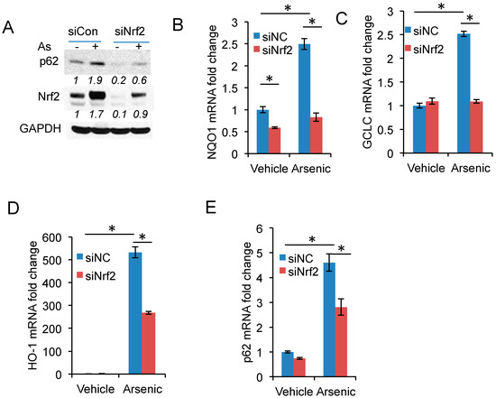 Nrf2 activation is required for arsenic-induced p62 expression: (A) Immunoblot analysis of p62, Nrf2, and GAPDH in HaCaT cells transfected with siRNA targeting negative control (siCon) or Nrf2 (siNrf2). The cells were treated with or without arsenic (8 μM) for 6 h; (B–E) Real-time PCR analysis of the mRNA levels of: NQO1 (B); GCLC (C); HO-1 (D); and p62 (E) in cells as in (A). * p < 0.05, Student’s t-test, statistically significant between comparison groups.