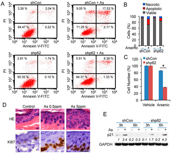 p62 up-regulation is critical for cell proliferation following arsenic treatment: (A) Flow cytometric analysis of apoptosis in shCon and shp62 cells treated with or without arsenic (25 μM) for 24 h; (B) Quantification of necrotic, apoptotic, or viable cells from (A); (C) CCK8 analysis of cell numbers in shCon or shp62 HaCaT cells treated with or without arsenic (20 μM) for 24 h. * p < 0.05, Student’s t-test, statistically significant between comparison groups; (D) Histological analysis after HE staining and immunohistochemical analysis of Ki67 in the epidermis of mice treated with or without arsenic (0.5 or 5 ppm). Scale bar, 20 μm; (E) Immunoblot analysis of p21 and GAPDH in shCon and shp62 HaCaT cells treated with or without arsenic (8 μM) for 3 or 6 h.