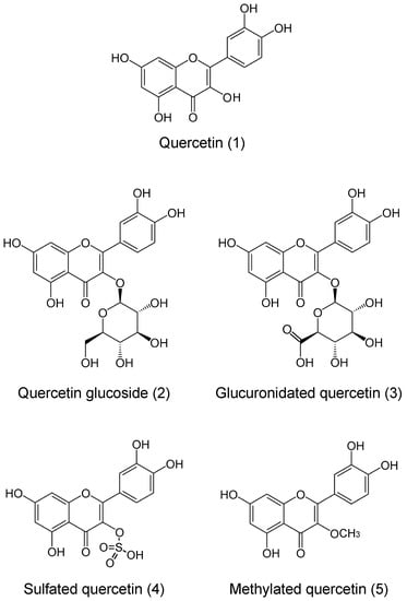 - Crespy, V.; Morand, C.; Manach, C.; Besson, C.; Demigne, C.; Remesy, C. Part of quercetin absorbed in the small intestine is conjugated and further secreted in the intestinal lumen. Am. J. Physiol. Gastrointest. Liver Physiol. 1999, 277, G120–G126. [Google Scholar]
