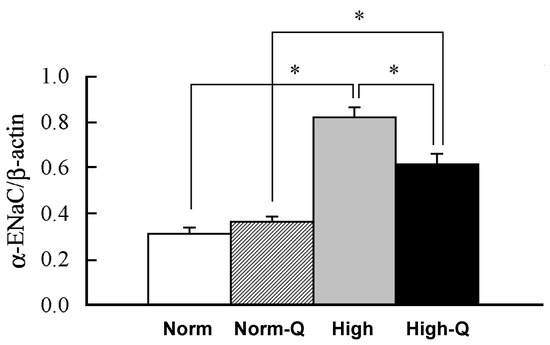 mRNA expression of αENaC in the kidney of Dahl salt-sensitive hypertension rats. The amount of mRNA expression of αENaC is expressed as the ratio to β-actin expression. Data are represented as means ± SEM obtained from four rats. Norm: normal diet; Norm-Q: normal diet with quercetin; High: high-NaCl diet and High-Q: high-NaCl diet with quercetin. * Significant difference at the level of p < 0.05. Quercetin (10 mg/kg/day) was orally applied. Adopted from [15] with allowance for non-profit use of the figure.