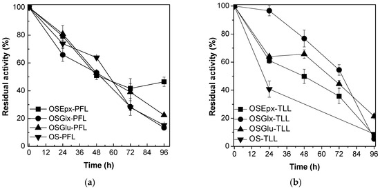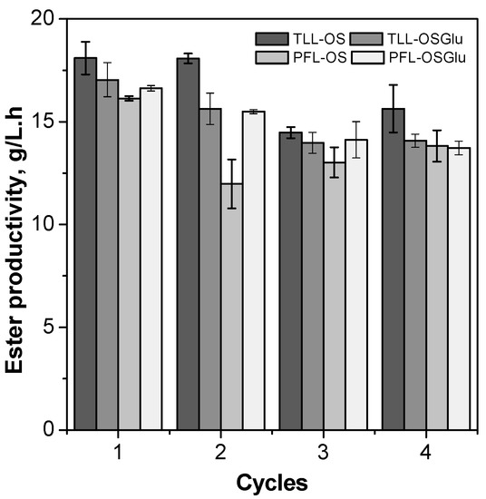 - Suescun, A.; Rueda, N.; Santos, J.C.S.; Castillo, J.J.; Ortiz, C.; Torres, R.; Barbosa, O.; Fernandez-Lafuente, R. Immobilization of lipases on glyoxyl–octyl supports: Improved stability and reactivation strategies. Process Biochem. 2015, 50, 1211–1217. [Google Scholar] [CrossRef]